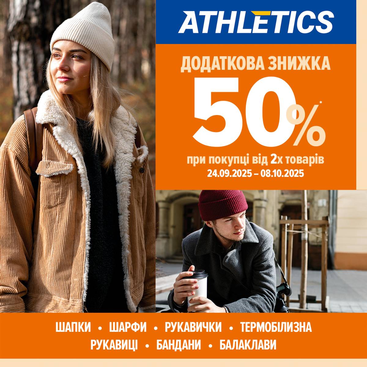 Тільки зараз в магазинах ATHLETICS додаткова знижка 50% на стильні аксесуари при покупці від 2х одиниць: