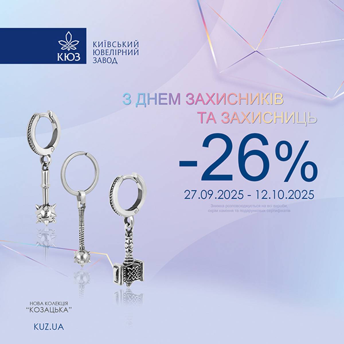 Київський ювелірний завод дарує 26% знижки на всі прикраси.